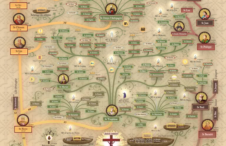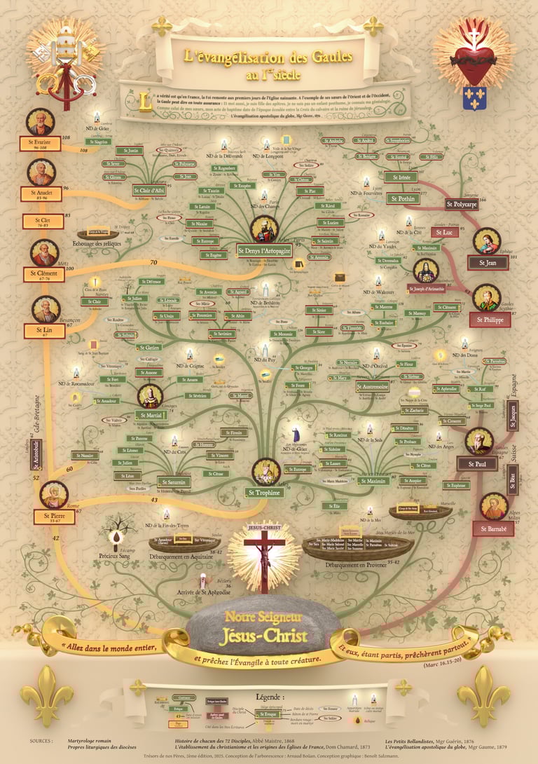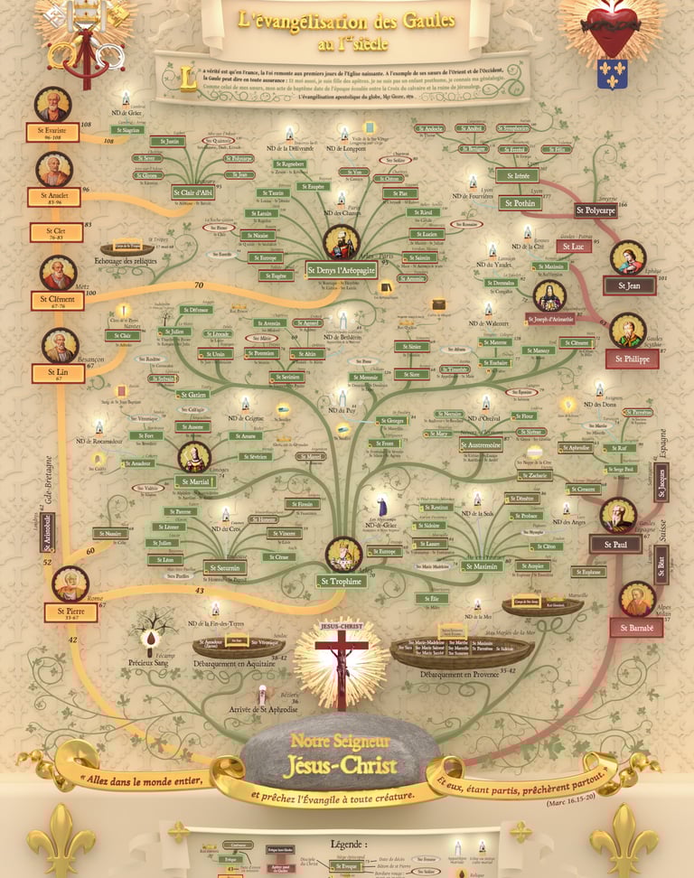Présentant les témoins directs des faits et miracles de Palestine, cette carte montre la prédilection de Dieu pour la Gaule. Accueillant les barques des saintes Maries et de sainte Véronique, puis les premiers saints évêques, dont un enfant qui tenait une corbeille lors de la multiplication des pains, saint Martial de Limoges ; le ressuscité de Béthanie, saint Lazare de Marseille ; le petit homme qui grimpa dans le sycomore, Zachée ou saint Amadour ; le fils de la veuve de Naïm, saint Materne de Cologne etc... Et tant d'autres méconnus, c'est pourquoi à juste titre on appelle la France Fille aînée de l’Église, évangélisée au plus tôt par les plus proches amis de Jésus !